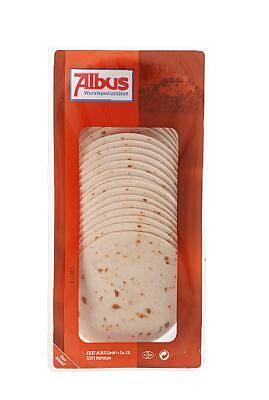 Brühwurst fein zerkleinert mit einer grünen und roten Einlage aus Paprika. 6 SL im Ktn - 28 Scheiben in der Schale gefächert