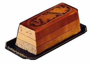 dreischichtige Mousse aus Hühner-, Enten- und Schweinelebercreme, Waldpilzen Portwein und Cognac.